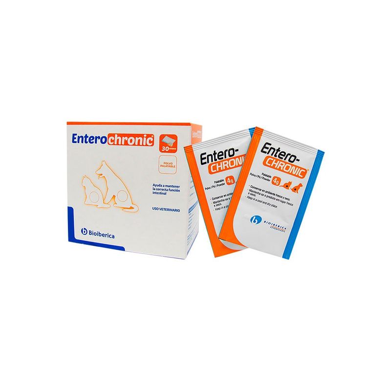 Entero Chronic Para Mascotas es un suplemento veterinario formulado para apoyar la salud gastrointestinal en perros y gatos con trastornos digestivos crónicos. Su composición contribuye a restaurar el equilibrio intestinal, proteger la mucosa digestiva y mejorar la absorción de nutrientes, ayudando a controlar signos como diarrea recurrente, heces blandas, inflamación intestinal o sensibilidad digestiva.
