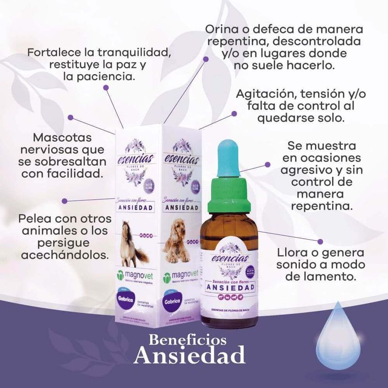 Esencias Florales Para Mascotas Ansiedad es un complemento natural formulado para ayudar a perros y gatos a manejar estados de ansiedad, inseguridad y tensión emocional. Su fórmula con esencias florales trabaja de forma suave para promover tranquilidad, equilibrio y una respuesta emocional más estable ante situaciones estresantes como visitas al veterinario, cambios de rutina, ruidos fuertes o separación. Es una solución segura y no sedante que puede usarse en conjunto con programas de entrenamiento conductual o rutinas de bienestar.