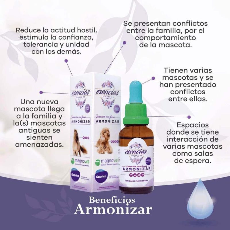 Esencias Florales Para Mascotas Armonizar es un complemento natural diseñado para promover el equilibrio emocional y la estabilidad conductual en perros y gatos. Su fórmula con esencias florales trabaja sobre estados emocionales como inquietud, irritabilidad, cambios de humor o tensión social, ayudando a restablecer una respuesta emocional más calmada y armoniosa. Puede utilizarse como apoyo en situaciones de adaptación, convivencia con otros animales o cambios en el entorno, sin causar somnolencia ni dependencia.