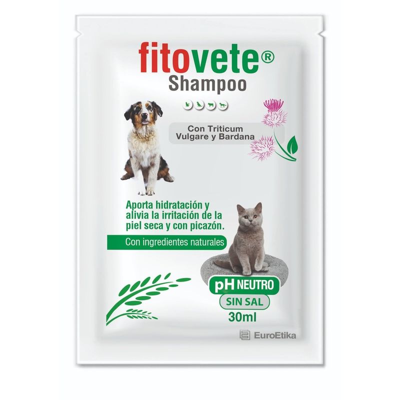 Fitovete Shampoo es un limpiador dermatológico diseñado para perros y gatos con piel normal, seca, sensible, irritada o con tendencia atópica. Su fórmula incluye extracto acuoso de Triticum vulgare al 15 %, que estimula la reepitelización y ayuda en el proceso de cicatrización de alteraciones ulcero-distróficas de la piel.
