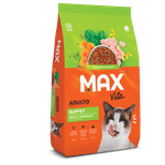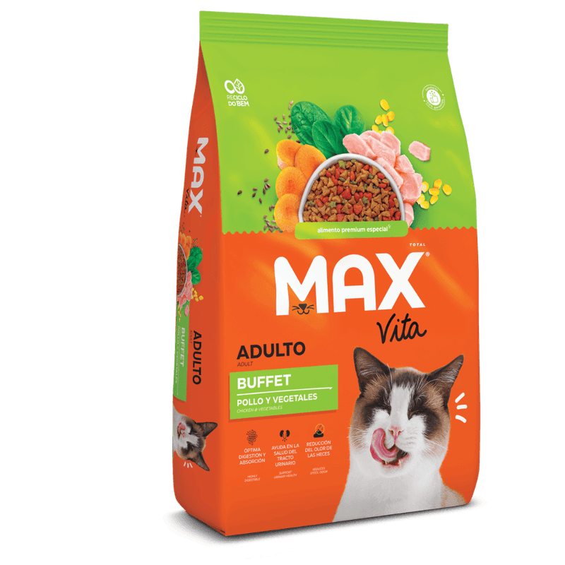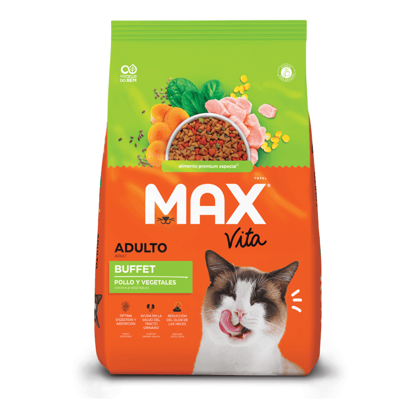 Max Vita Alimento Para Gato Adulto Buffet Pollo y Vegetales es un alimento balanceado que combina proteína de pollo con vegetales seleccionados para una nutrición completa. Su fórmula favorece la digestión, mantiene la masa muscular y aporta vitaminas y minerales esenciales para la vitalidad diaria del gato adulto. Ideal para una alimentación equilibrada y de buen sabor, disponible en Petus by Silveragro.