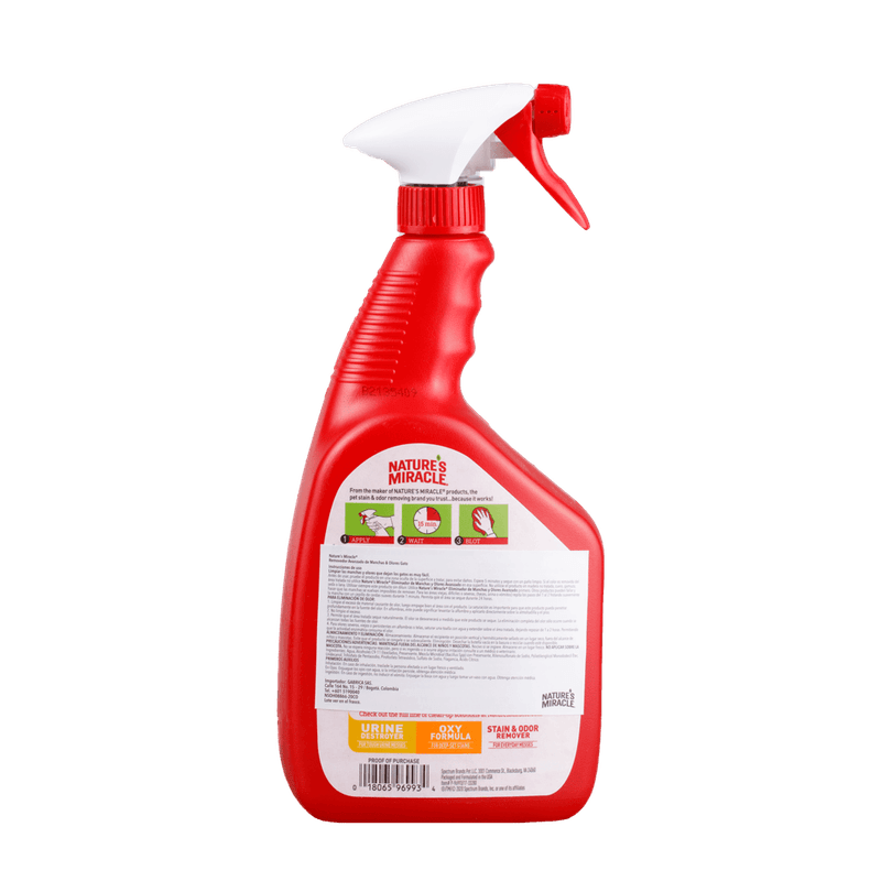 Nature Miracle Eliminador De Manchas y Olores Avanzado Para Gato es un limpiador enzimático especializado en eliminar eficazmente manchas y olores causados por orina, heces y otras fuentes felinas. Su fórmula avanzada rompe las moléculas responsables del mal olor, neutralizando la fuente en lugar de enmascararla, y dejando las superficies limpias y con un aroma fresco. Es seguro para usar en alfombras, muebles, pisos y otras áreas del hogar donde los gatos suelen transitar o marcar, ayudando a mantener un ambiente higiénico y agradable.