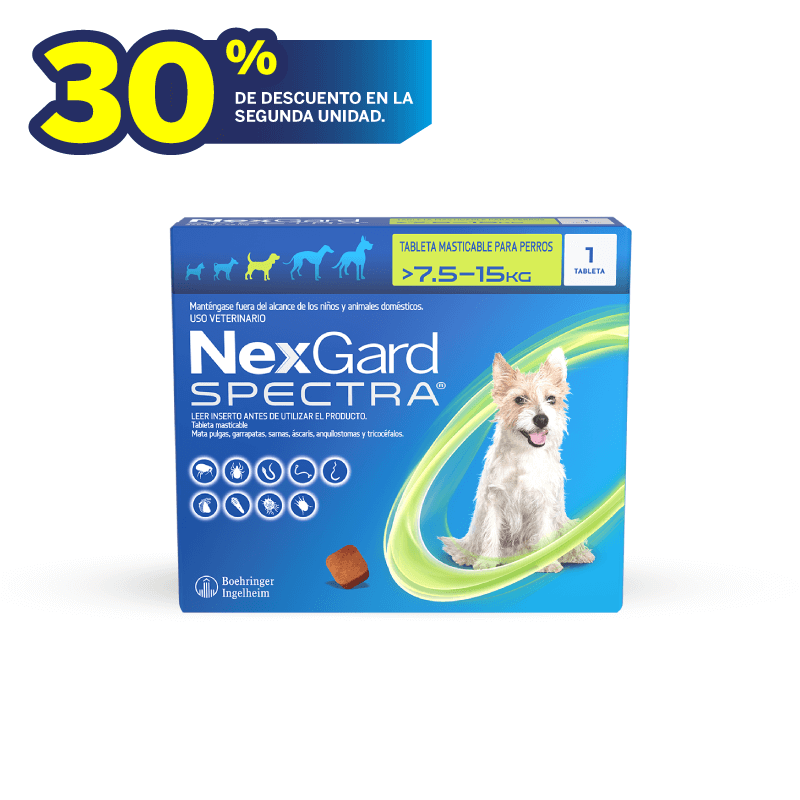 NexGard Spectra es un antipulgas para perros que desparasitará no solo externamente sino también de forma interna, pues también actúa sobre los nematodos gastrointestinales que son parásitos internos que pueden afectar a nuestros perros. Además, es un potente preventor contra la filariosis, más conocido como el parásito que causa la enfermedad del gusano en el corazón. NexGard será la opción más eficaz, potente, completa y efectiva para prevenir y eliminar los parásitos en el organismo de tu perro.
