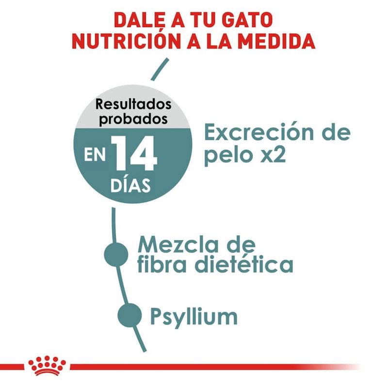 Royal Canin Hairball Care es un alimento seco para gatos adultos formulado para reducir la formación de bolas de pelo. Gracias a su exclusivo complejo de fibras, estimula el tránsito intestinal natural, ayudando a que el pelo ingerido se elimine de forma más efectiva. Además, aporta proteínas de alta digestibilidad y nutrientes esenciales que apoyan la salud digestiva y el bienestar general del gato.