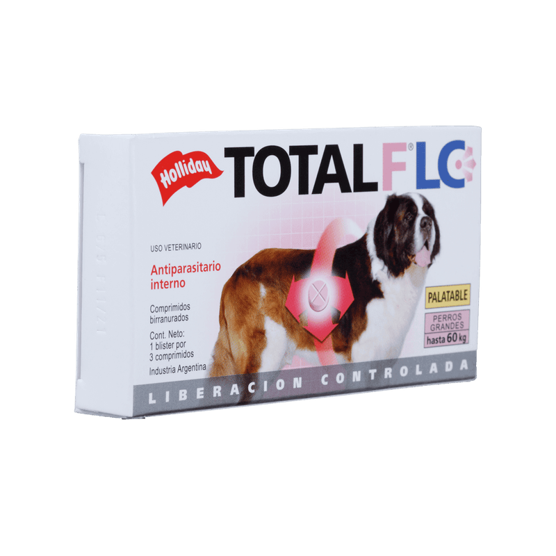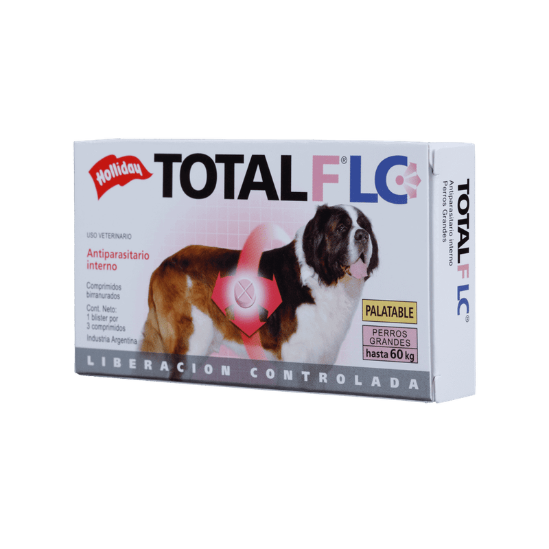 Total FLC Desparasitante Interno Para Perro Grande es un antiparasitario veterinario diseñado para eliminar y controlar parásitos intestinales comunes como nematodos y cestodos en perros de talla grande. Su fórmula actúa eficazmente en el tracto gastrointestinal, ayudando a prevenir infestaciones, mejorar la salud digestiva y reducir signos asociados como diarrea, pérdida de peso o malestar general. Es una opción eficaz dentro de los programas regulares de desparasitación interna en perros grandes, siempre bajo supervisión veterinaria.